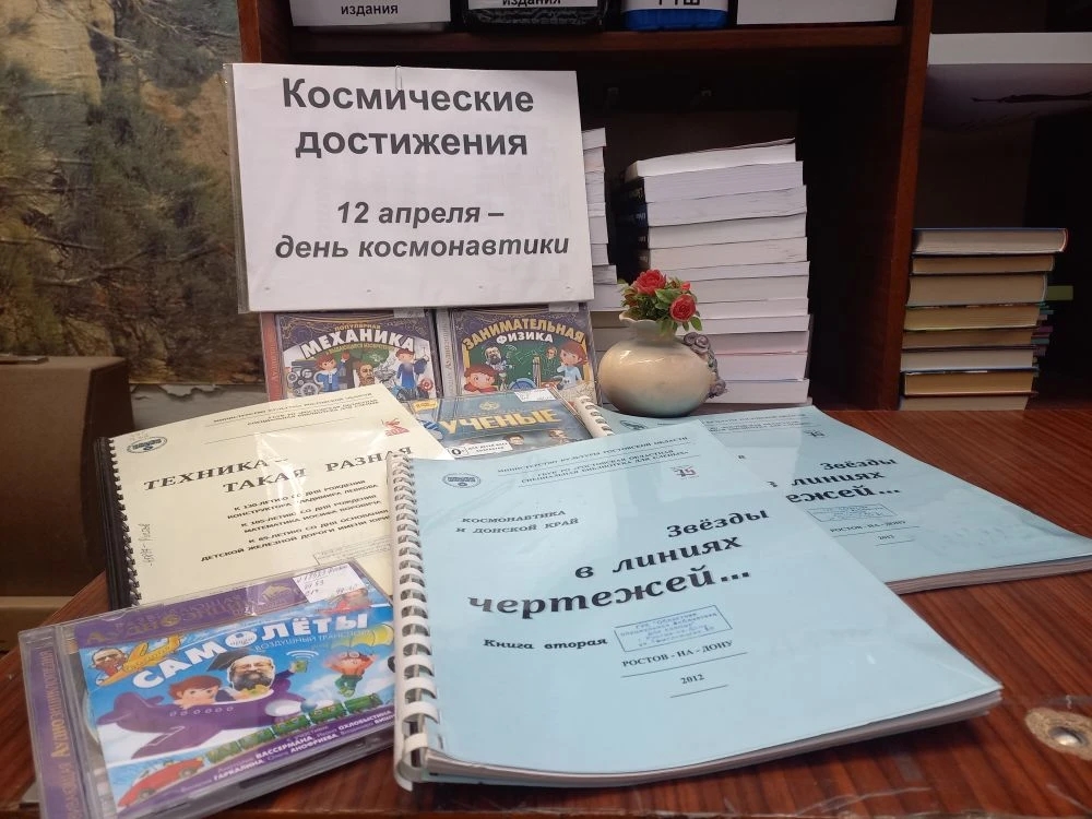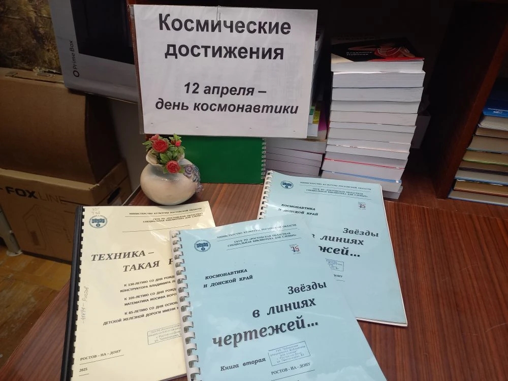 К Международному дню космонавтики в Ростовском пункте выдачи оформлена книжная выставка «Космические достижения», где представлены несколько тифлокраеведческих сборников, которые в разные годы издала Ростовская областная библиотека для слепых. Они рассказывают о вкладе в развитие российской космонавтики учеными-инженерами и космонавтами Донского края: «Звезды в линиях чертежей...», «Оборона страны» и «Тщательный отбор».