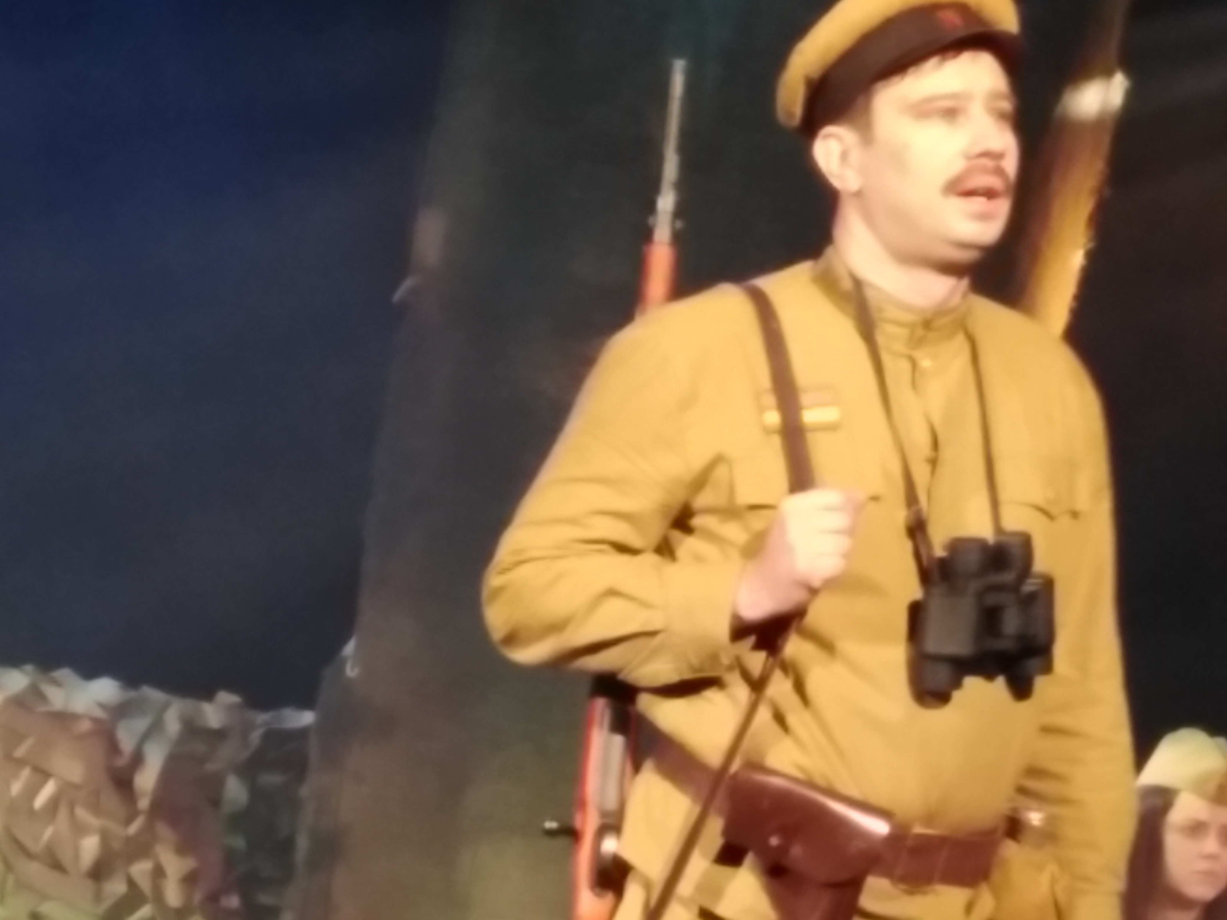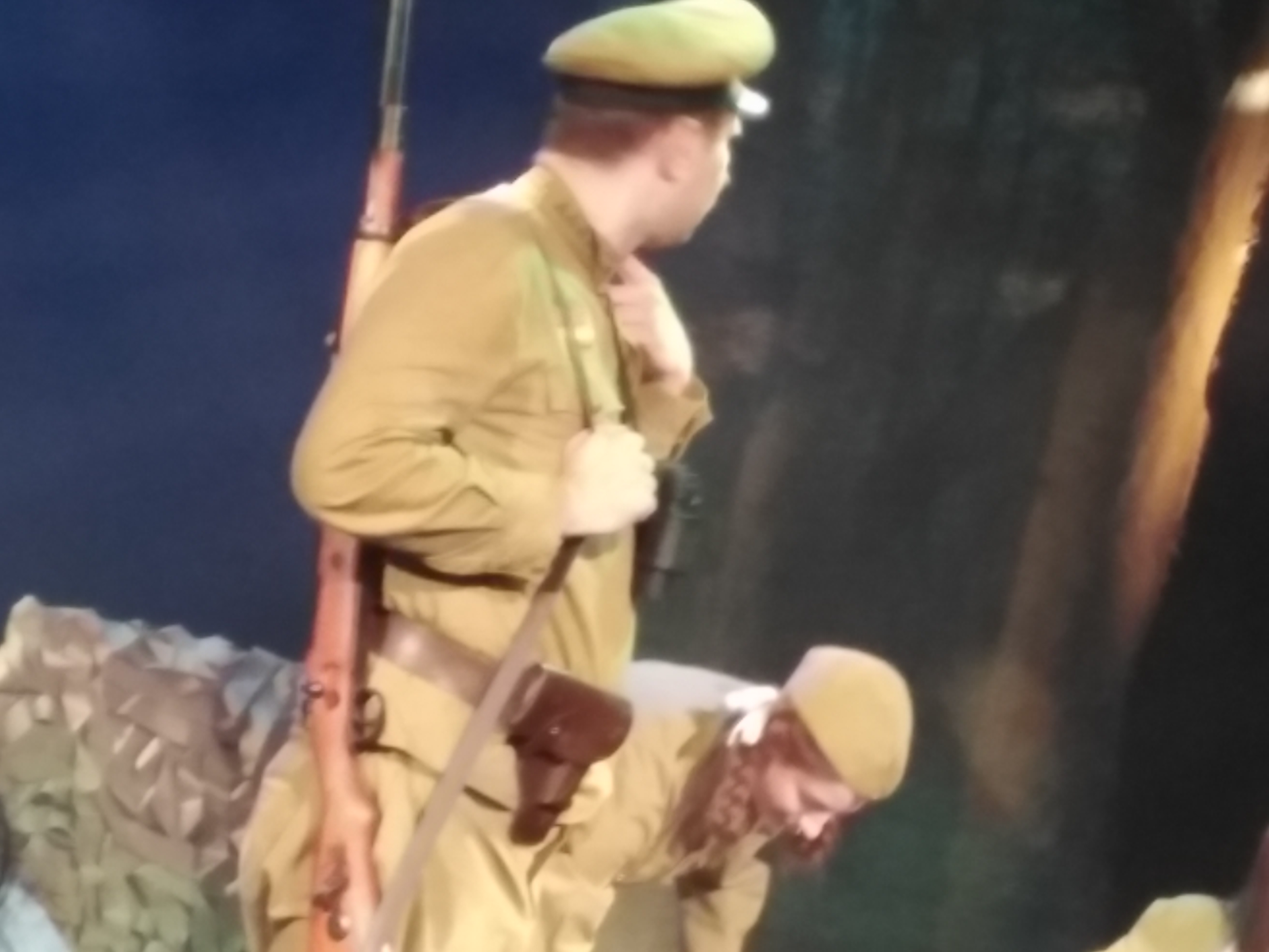 Спектакль режиссера Михаила Сопова «А зори здесь тихие» поставлен по одноименной повести Бориса Васильева. Тифлокомментатор Татьяна Засецкая готовит тифлокомментарии к спектаклю и проводит их прямое транслирование. Спектакль настолько понравился, что гости из Ростова-на-Дону продолжили общение в фойе с режиссером и тифлокомментатором.