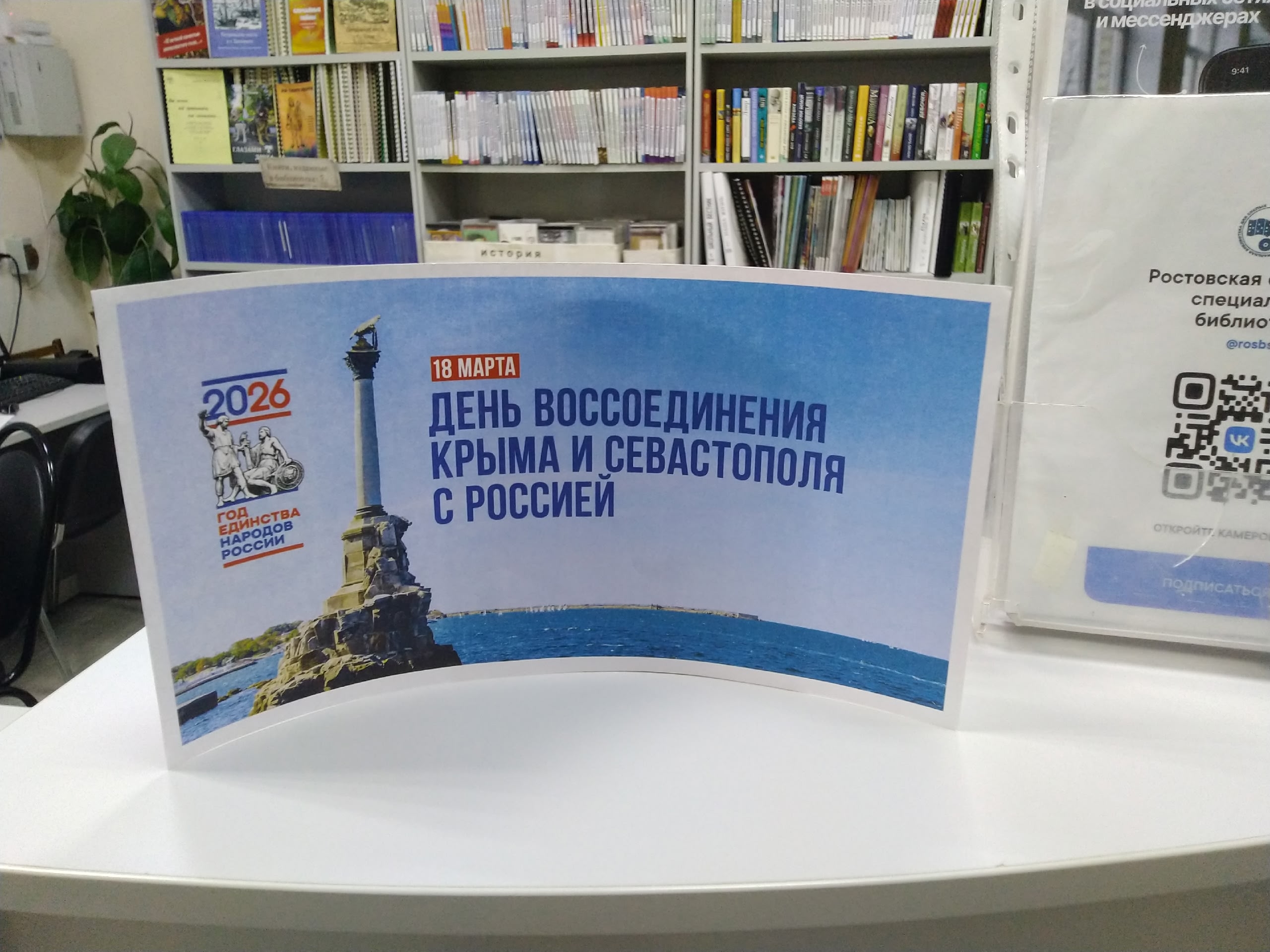 Ростовская библиотека для слепых приглашает ознакомиться с тематической выставкой «Крым в истории России» ко Дню воссоединения Крыма с Россией. Экспозиция знакомит с богатой и сложной историей полуострова от древних времен до вхождения в состав Российской империи в 1783 году при Екатерине II, от героических страниц в Русско-турецких войнах и в годы Великой Отечественной войны до хроники событий «Крымской весны» 2014 года и достижений полуострова в составе современной России. На выставке представлены научные и научно-популярные издания, мемуары, а также материалы периодической печати.