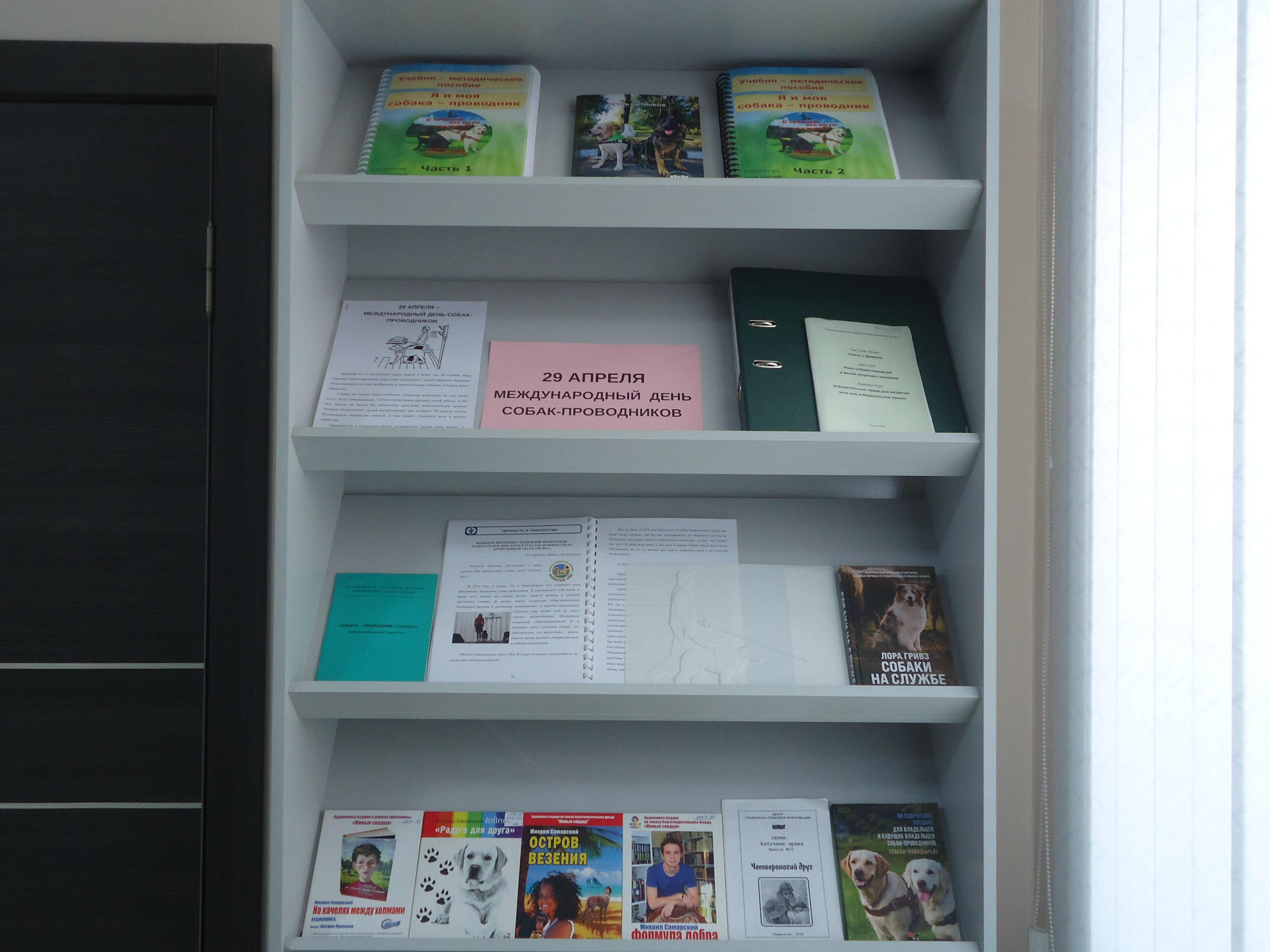 На выставки представлены книги нашего земляка писателя, блогера, общественного деятеля Михаила Самарского «На качелях между холмами», «Радуга для друга», «Формула добра», «Остров везения»; сборник очерков о собаках-проводниках и их владельцах сотрудника Ростовской библиотеки для слепых Игоря Ситникова «Глазами друга»; статьи из различных изданий; пособия для владельцев-собак проводников.