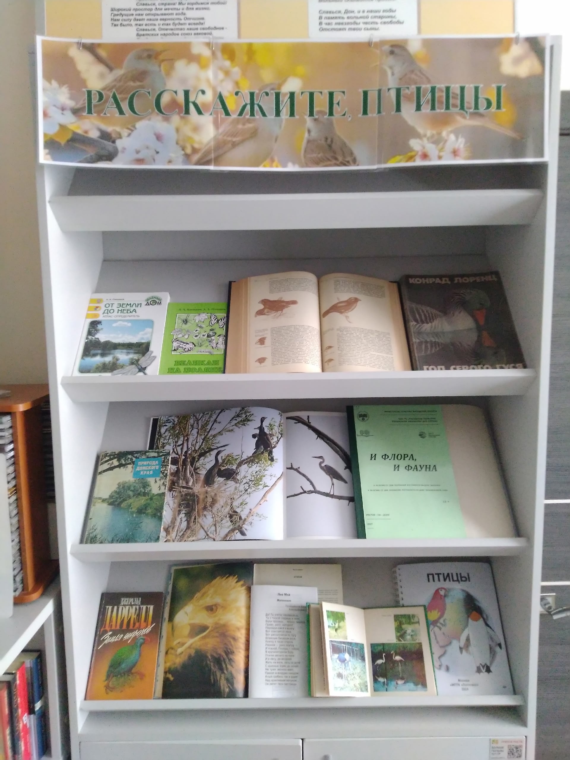 1 апреля Россия отмечает Международный день птиц. Этот экологический праздник является наиболее известным праздником, посвящённым птицам. На выставке «Расскажите, птицы», посвящённой этому дню, представлены художественные и научно-популярные книги о птицах. Среди них: «Год серого гуся» австрийского зоолога и одного из основоположников этологии — науки о поведении животных Конрада Лоренца, «Путешествие натуралиста вокруг света на корабле “Бигль“» Чарльза Дарвина; энциклопедии и атласы определители, а также книги о природе донского края. Также представлены книги в спецформатах: издание Ростовской библиотеки для слепых «И флора, и фауна» и альбом рельефно-графических рисунков «Птицы».
